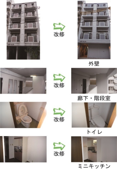外壁のひび割れ(クラック)補修、外壁塗装、トイレ・ミニキッチン等の入替え、壁・床張替えなど