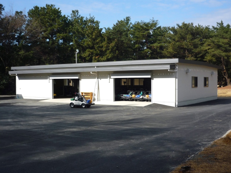 キャディーハウスとカート庫です。当社が最も得意とするSHタイプのプレハブ建築です。外壁は最もシンプルなアイボリー色で仕上げております。SHタイプは小規模オフィスから大規模な施設まで幅広い対応が可能です。