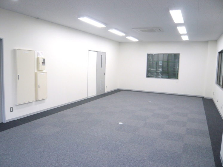 内装は事務所スペースも外壁と違和感無いようにカーペットの色を分け